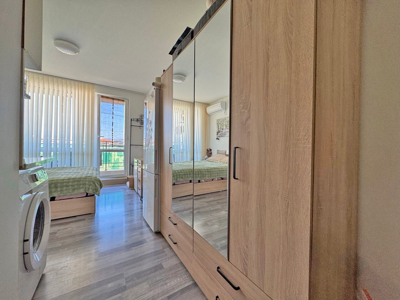 Распределение: светлая комната с зонами для сна и отдыха, удобный балкон для утреннего кофе или вечернего отдыха, а также ванная комната. Квартира ухоженная, с хорошим ремонтом и ощущением уюта.