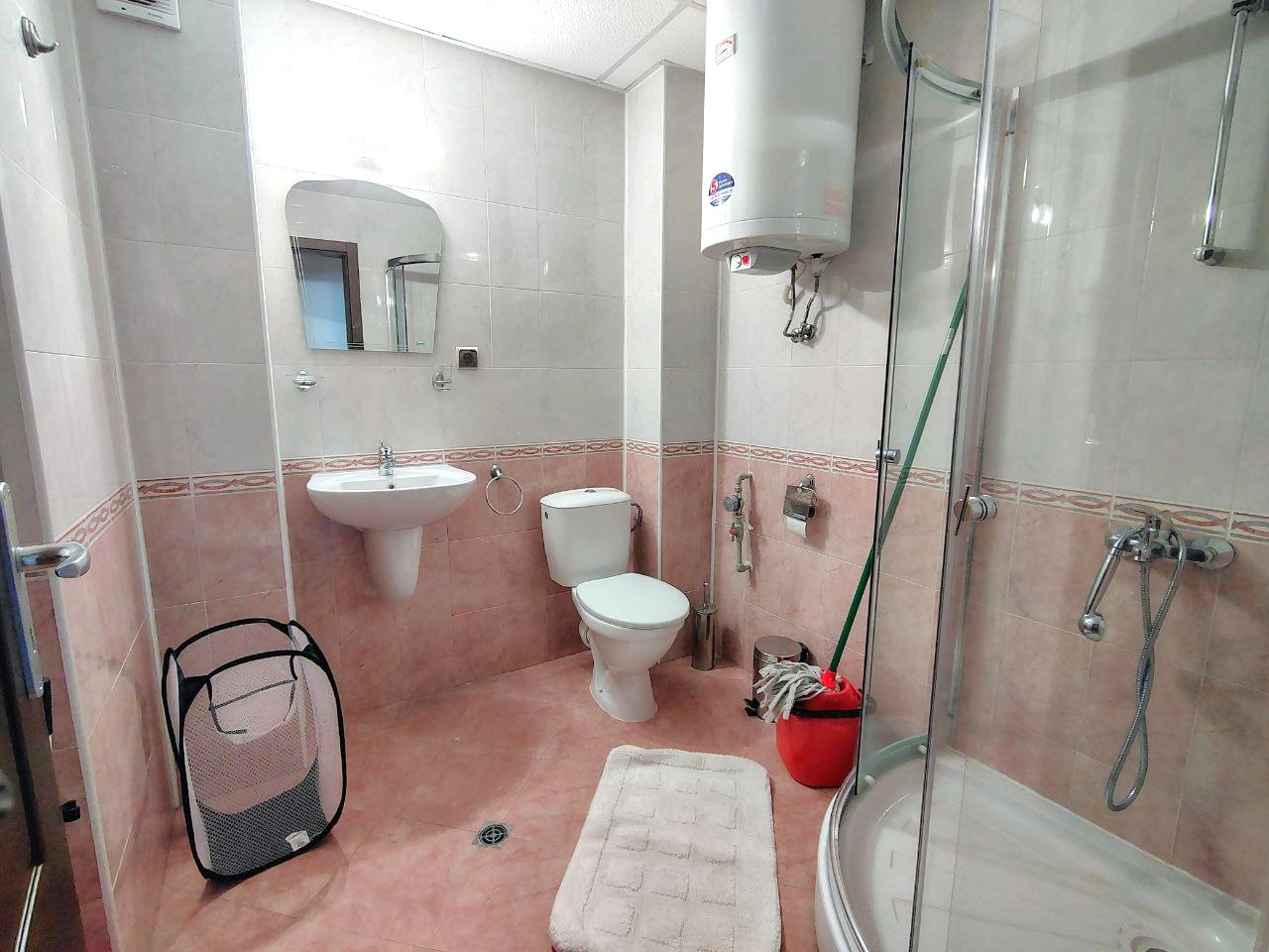 Полностью оборудованная ванная комната с туалетом, раковиной, зеркалом, бойлером для горячей воды и душевой кабиной.