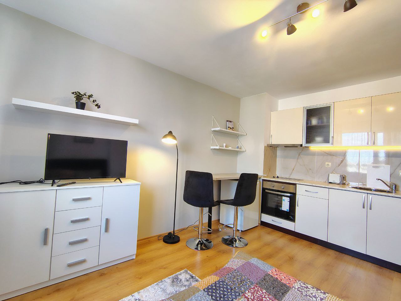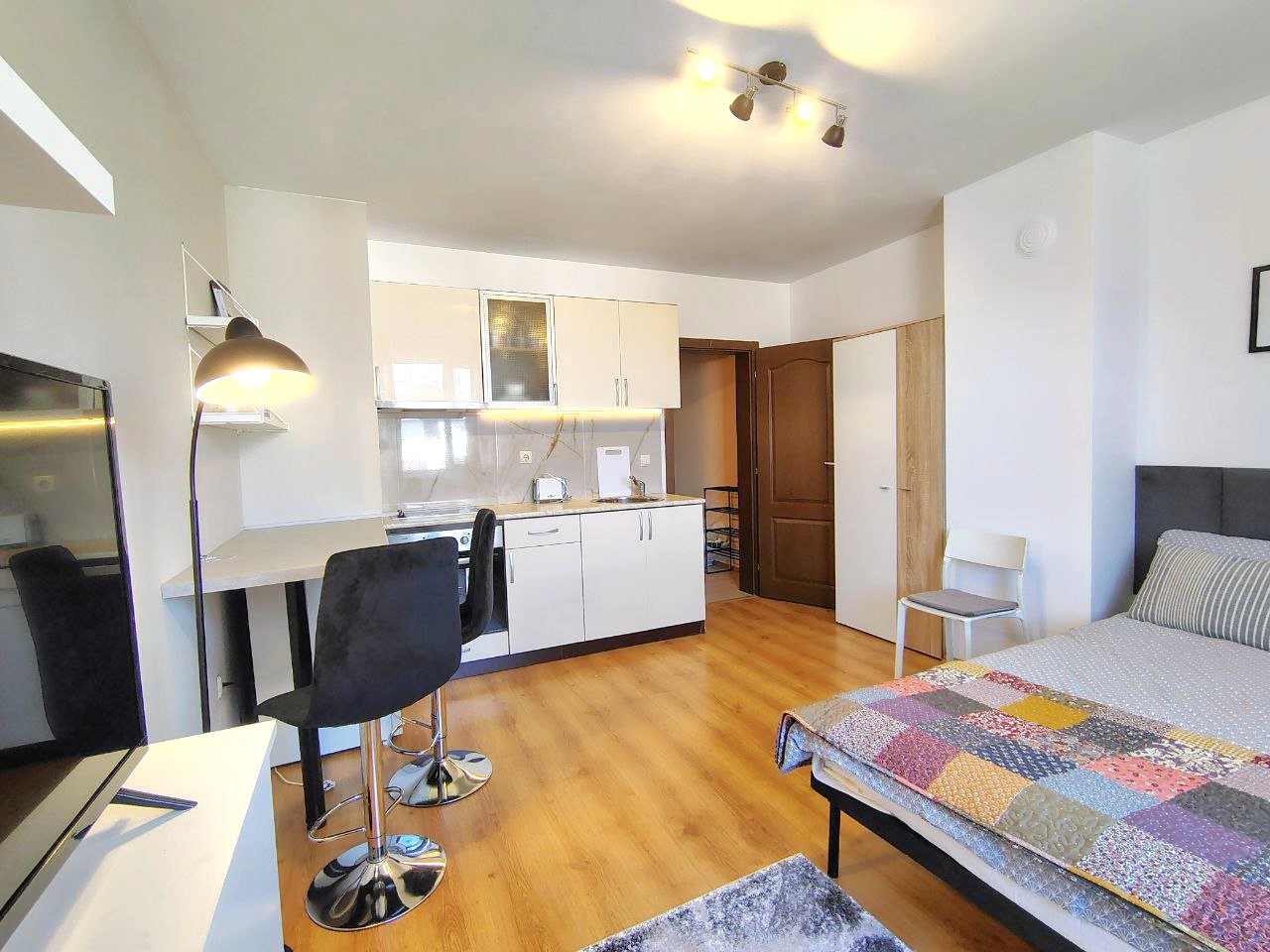 Кухонная зона с оборудованной кухней, спальная зона с кроватью, телевизором и тумбой.