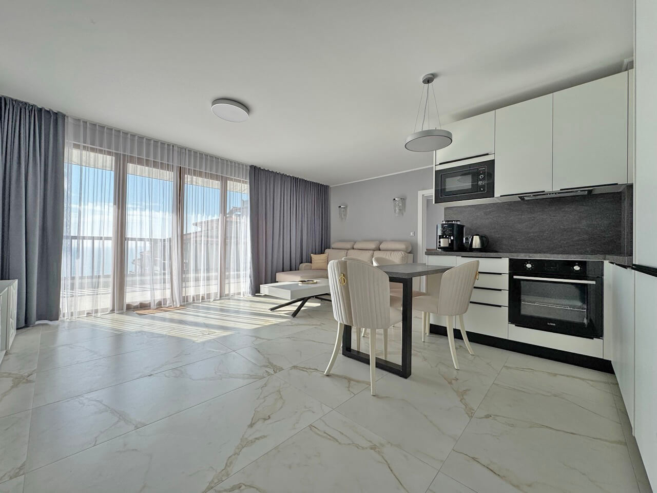 На облагороженной территории с ландшафтным дизайном расположен бассейн с детской секцией, ресторан, детская площадка, охраняемая парковка, рецепция и консьерж сервис, бар у бассейна, магазин, круглосуточная охрана, поддержка комплекса управляющей компанией круглый год, услуги по сдачи апартамента в аренду. До шикарного пляжа расстояние всего лишь 20 метров.