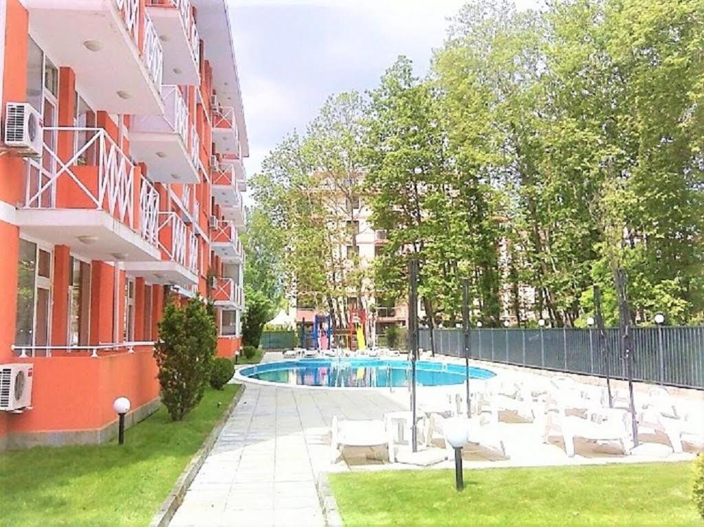 С обратной стороны здания расположен большой открытый бассейн с детской секцией.